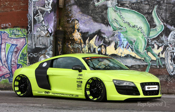 Однако в этот раз мастера ателье XXX-Performance решили попробовать свои силы в доведении до ума R8 5.2 V10 FSI. Автомобиль отличается обширным кузовным пакетом – едва ли сейчас встретишь ярко-зелёный R8. Контраст с этим окрасом создают чёрная решётка радиатора и фары. Завершает улучшения комплект двадцатидюймовых дисков.