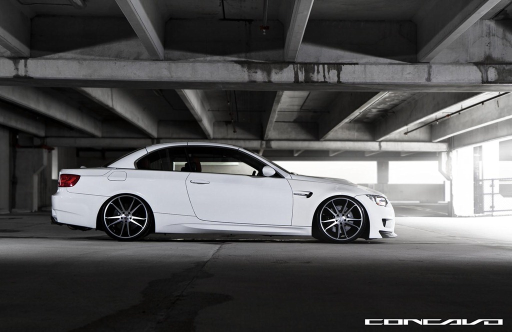 На фото – демо-кар американского тюнера и производителя колесных дисков Concavo, построенный на базе BMW E93 M3 Convertible. Он получил матово-черные легкосплавные колесные диски (с текстурой машинной обработки) размером 20×9 дюймов передние и 20×10.5 дюймов задние. Отдельно хочется отметить отличный стенс (stance, в переводе с англ. "посадка")