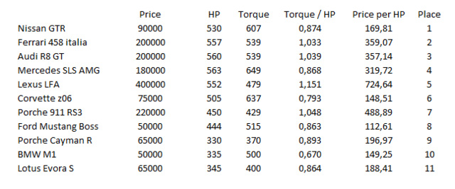 Победитель – Nissan GTR, сам список я расположил в порядке победных мест. Если кого интересуют краткие характеристики и цены автомобилей – прилагаю таблицу.