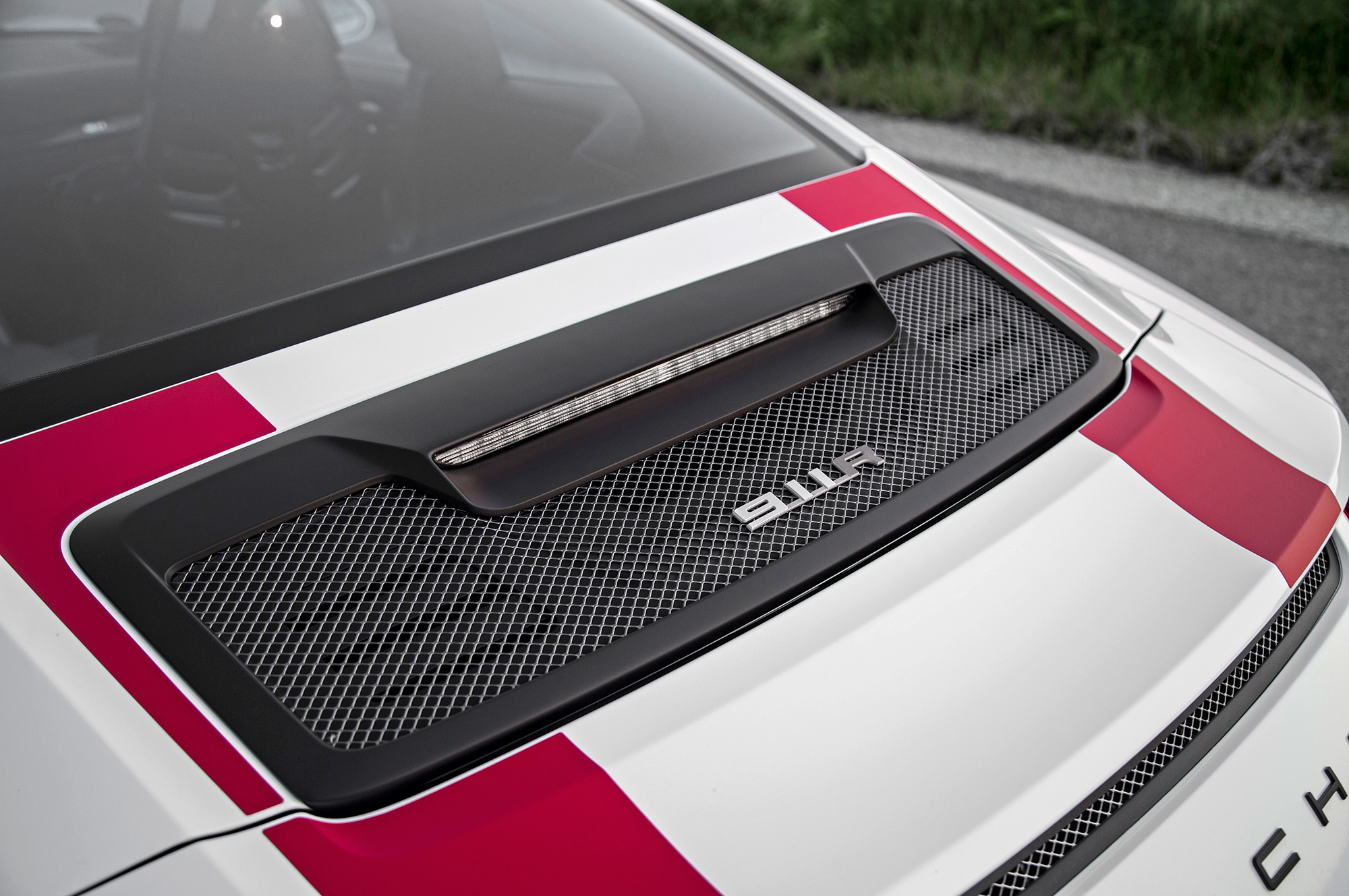 Кузов от GT3, передние крылья такие же по форме, как там, но углепластиковые. А крыша из магниевого сплава и пластик вместо задних стёкол — это уже GT3 RS. Но вместо стационарных антикрыльев — моторизованный спойлер от Карреры, ради увеличения максимальной скорости.